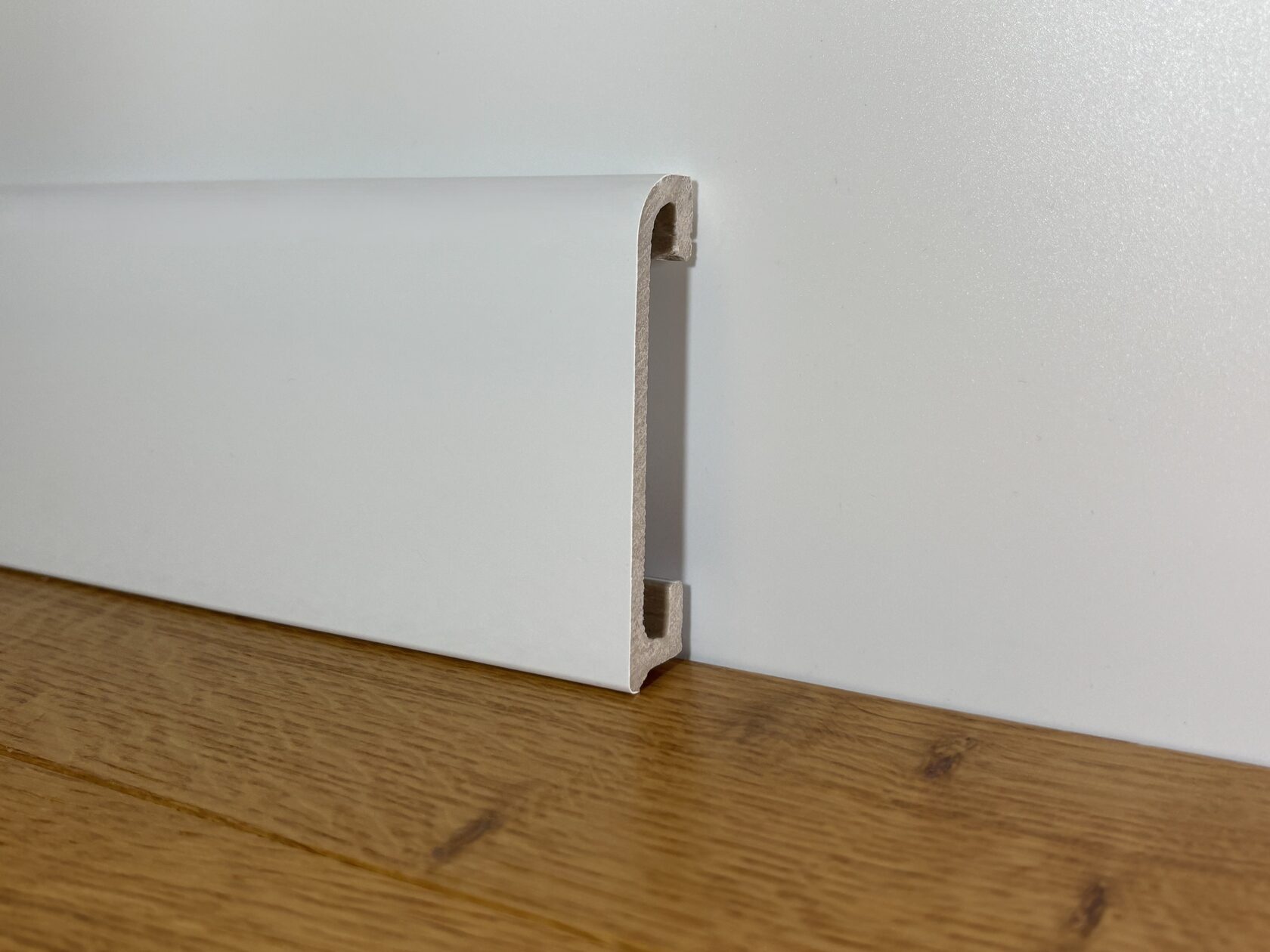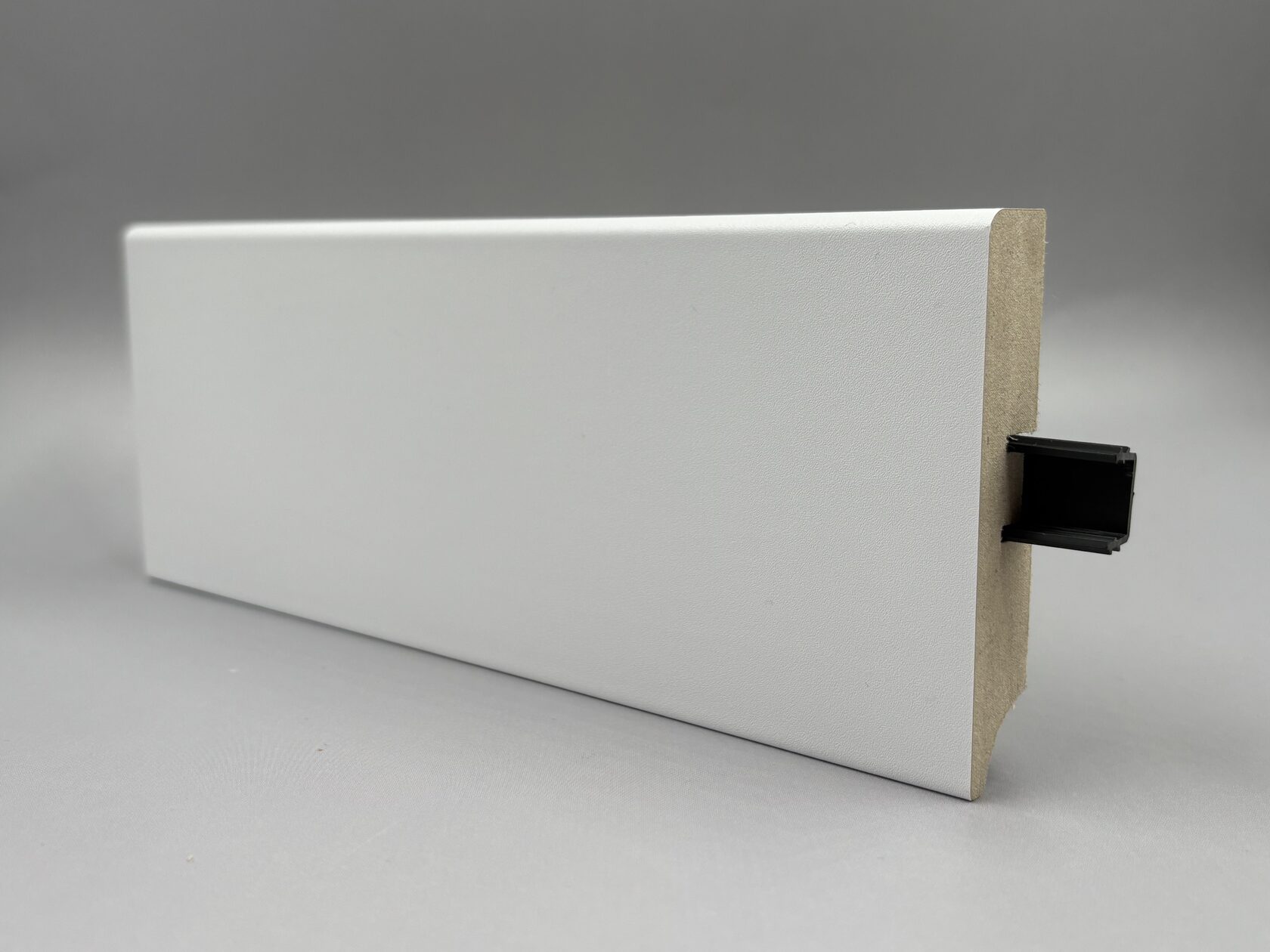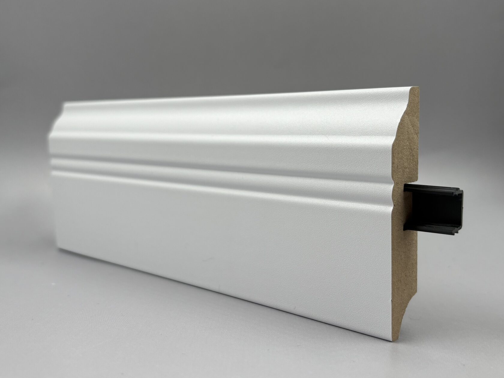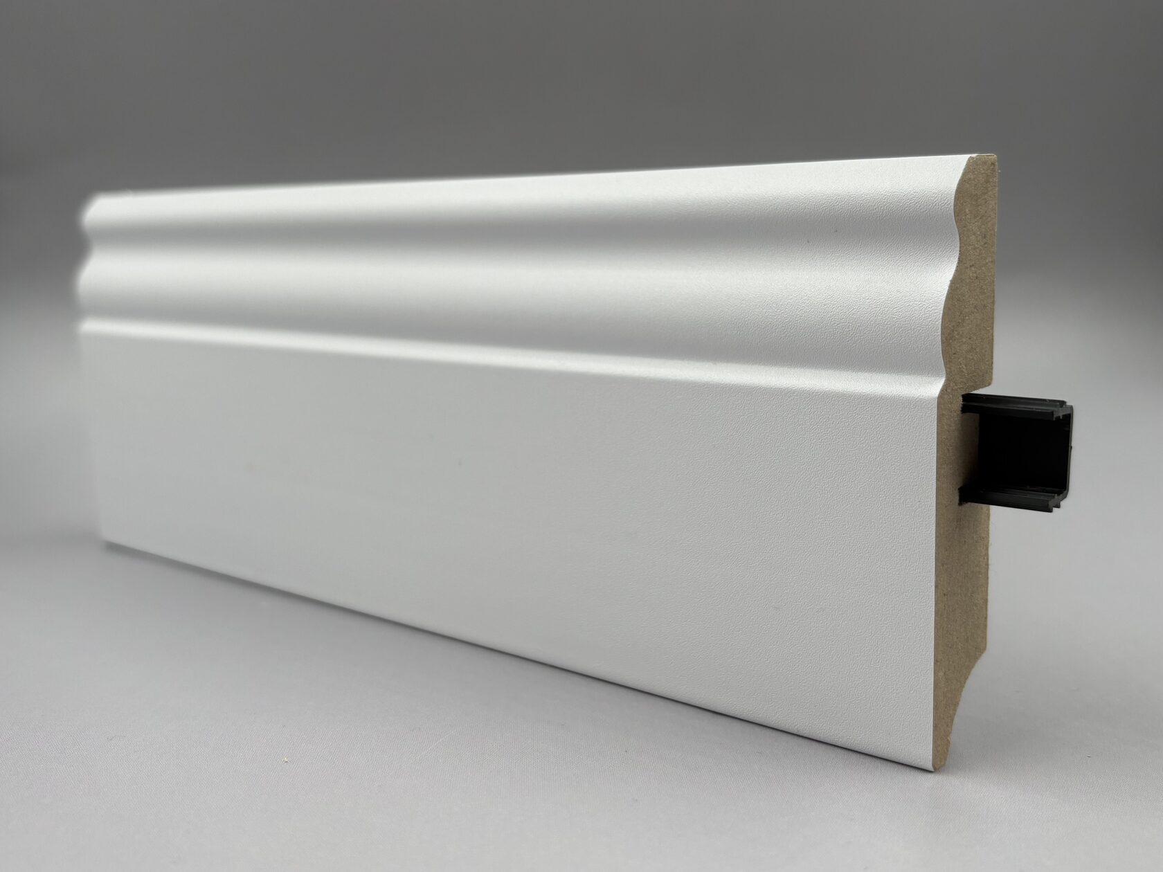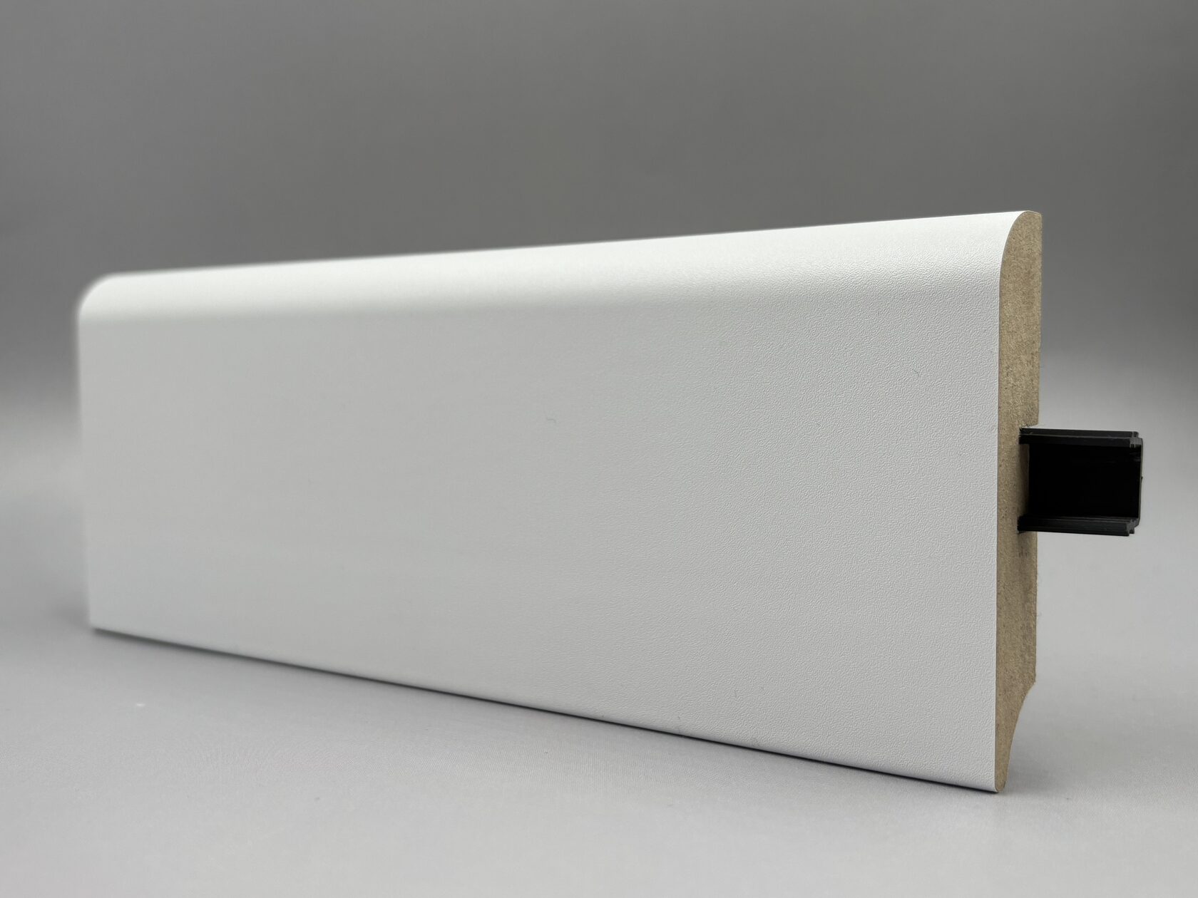 Плинтус МДФ белый оснащен защитным полимерным слоем, который предохраняет от влаги, царапин и химии для уборки. Его безупречная поверхность не притягивает грязь, устойчива к солнцу.